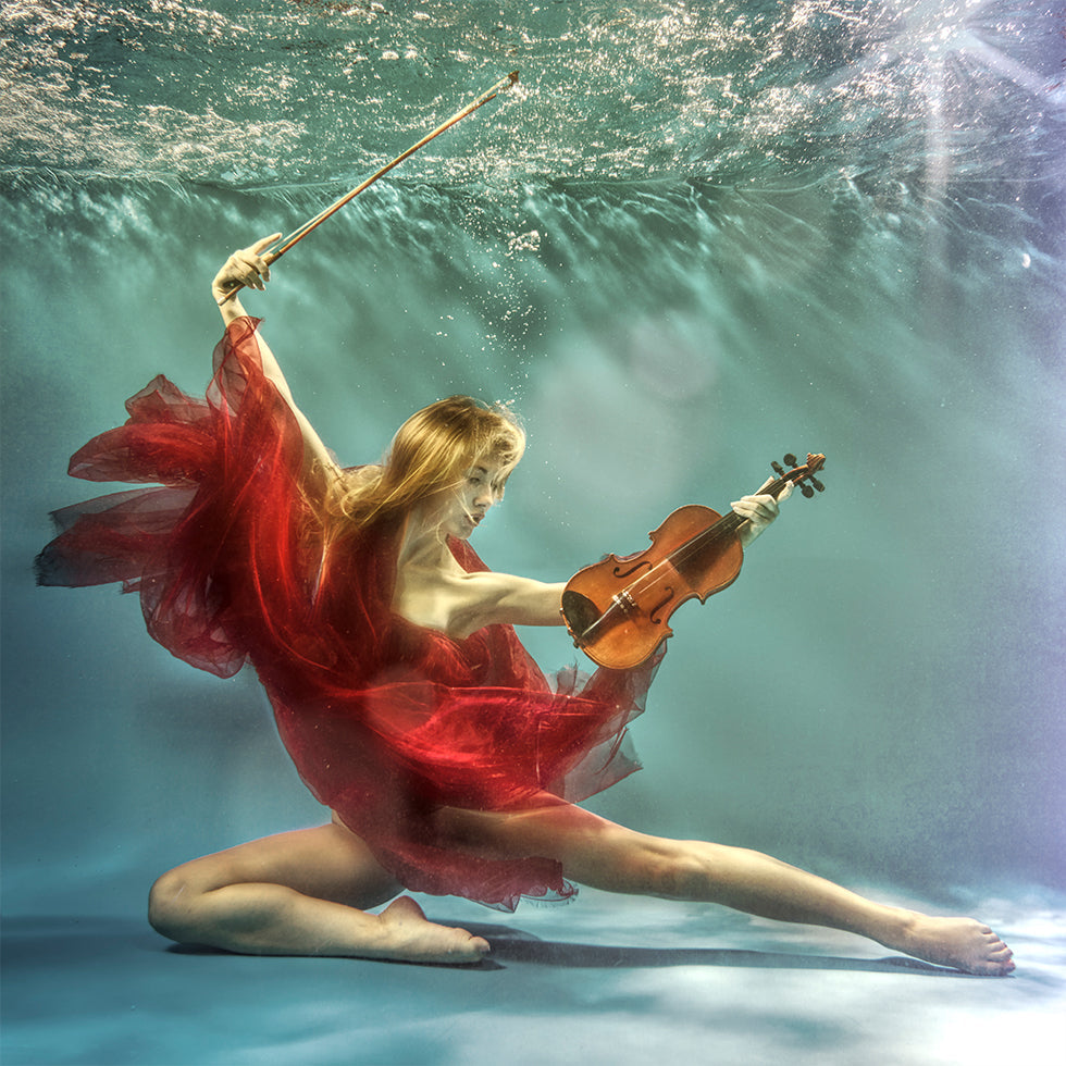 Um retrato subaquático sonhador onde um casal flutua numa piscina e toca violino entre bolhas luminosas e flores ondulantes. Romance e música fundem-se num prelúdio tranquilo que exala poesia, paixão e elegância leve. Fotografia de Uniquecapture, criada para evocar emoções. Perfeito como um chamariz central em casa.