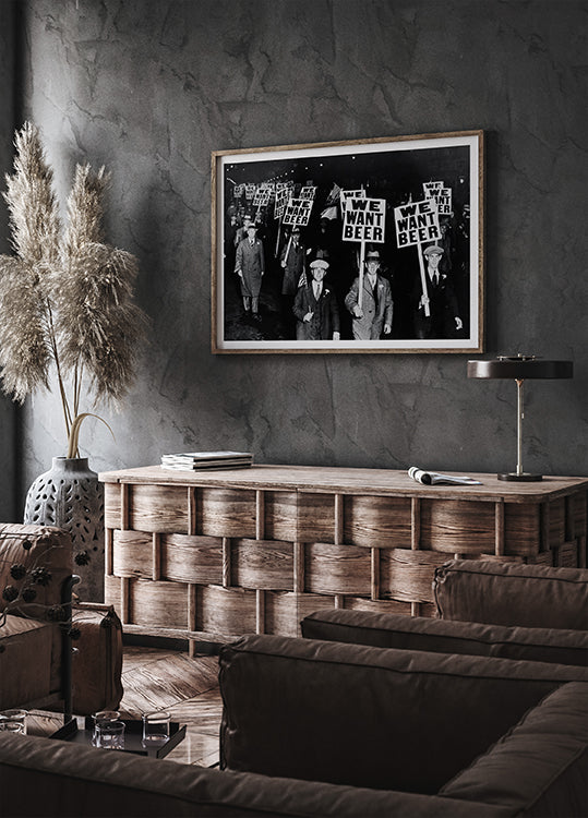 Uma notável fotografia vintage em preto e branco registrando um protesto histórico durante a Lei Seca. Manifestantes seguram cartazes com os dizeres "Queremos Cerveja", um poderoso símbolo da demanda pública por álcool no início do século XX. Perfeito para fãs de história, fotografia vintage e decoração de bar única.
