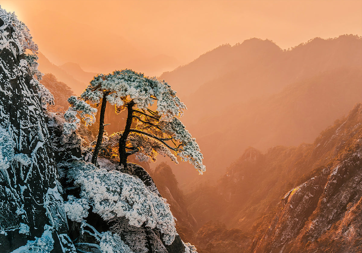 Resilience on the Edge, de Wei (David) Dai captura uma paisagem montanhosa invernal à primeira luz do dia: abetos cobertos de neve agarram-se à borda de um penhasco íngreme enquanto o brilho silencioso do sol surge no horizonte. Uma imagem de força e calma, onde o frio, a altura e a esperança se encontram num poético nascer do sol. Perfeito para sonhar com novos picos.