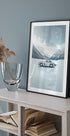 En retro sølvbil parkeret ved en frossen sø, omgivet af sneklædte bjerge og en høj, klar vinterhimmel. En elegant model tilfører et strejf af ski-lodge glamour og luksuriøs nostalgi. Kontrasten mellem isens ro og bilens klassiske linjer skaber en stemningsfuld, tidløs scene. Perfekt til elskere af retro og vinterlige landskaber.