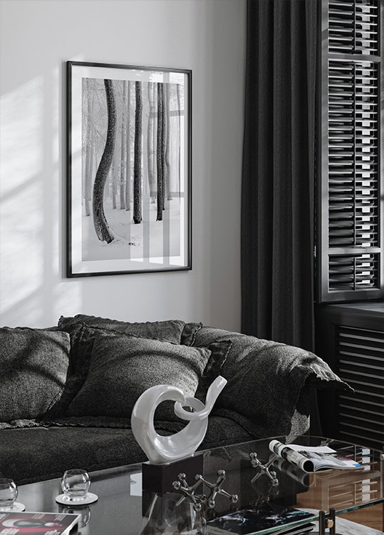 Shapes af Tom Pavlasek indfanger en tåget bøgeskov i sort-hvid, hvor slanke stammer danner grafiske mønstre i vinterdisen. Det minimalistiske motiv balancerer mellem natur og geometri og skaber en rolig, poetisk stemning, der inviterer til fordybelse og giver rummet en tidløs kant. Perfekt til moderne rum med sans for stilren ro.