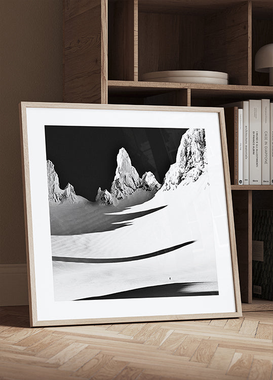 Pequeno e grande, de Åsmund Keilen, captura o contraste entre o homem e a natureza: um pequeno esquiador se move sobre uma cordilheira nevada abaixo de montanhas monumentais em preto e branco na Noruega. Destaques e sombras profundas criam calma gráfica, silêncio gelado e uma sensação atemporal de aventura e altas montanhas. Inspirador para o lar e para todos que gostam do drama tranquilo do inverno.
