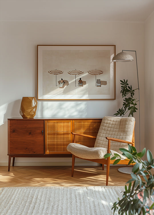 Uma ilustração calma e simples com três guarda-sóis listrados e duas pessoas em espreguiçadeiras em uma praia iluminada. As cores suaves e a composição relaxante criam uma sensação de tranquilidade de verão e atmosfera mediterrânea. Perfeito para casas de veraneio, casas modernas ou paredes de galerias.