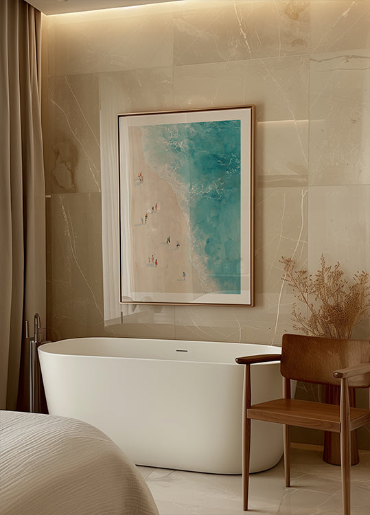 Uma foto aérea serena e elegante de pessoas caminhando pela orla, onde o mar azul-turquesa encontra a areia clara. Ideal para casas de veraneio, espaços com inspiração costeira e arte de parede moderna.