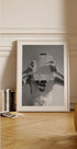 Uma impressionante fotografia de moda em preto e branco mostrando uma mulher segurando uma revista Vogue Italia na frente do rosto, usando um colar enorme e uma roupa texturizada. A obra de arte captura a mística e o fascínio do mundo da moda, uma mistura de anonimato e estilo arrojado. Perfeito para interiores modernos e paredes de galerias inspiradas na moda.