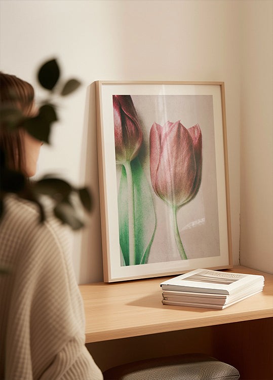To lyserøde tulipaner bøjer sig mod hinanden i et stille kys, indhyllet i blødt forårslys og pasteller. Fine skygger og makrodetaljer giver motivet poetisk ro og nærhed. Delphine Devos indfanger øjeblikket med minimalistisk elegance – en romantisk hyldest til håb, ømhed og ny begyndelse. Et stille blikfang til soveværelse og stue.