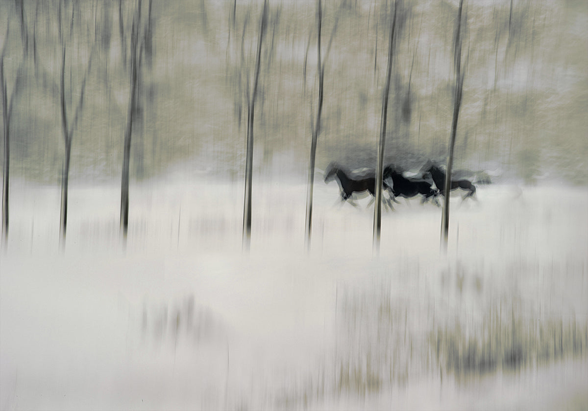 Tre heste bryder gennem vintertågen i en dynamisk gallop, indhyllet i snefnug og blød bevægelsesuskarphed. Milan Malovrh fanger øjeblikkets rå energi og poetiske stilhed på én gang, så motivet får et næsten spøgelsesagtigt skær – en minimalistisk, nordisk stemning fuld af fart og finesse og nærvær.