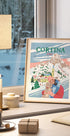 En stemningsfuld rejseplakat, der hylder Cortina d’Ampezzo: sneklædte alpetoppe, lifter over den livlige landsby og en smilende kvinde i elegant vinterlook, fanget i et tidløst, grafisk udtryk. Caroline Bonne Müller forener retro rejsestemning med moderne charme – perfekt til vinterdrømme med bløde pasteller og klare kontraster.