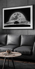 Esta obra de arte surreal em preto e branco mostra uma árvore solitária sob uma lua cheia brilhante, com pássaros voando acima de um céu noturno de sonho. Nuvens vagam pela cena luminosa, unindo fantasia e natureza em uma composição impressionante que captura mistério, maravilha e elegância atemporal.