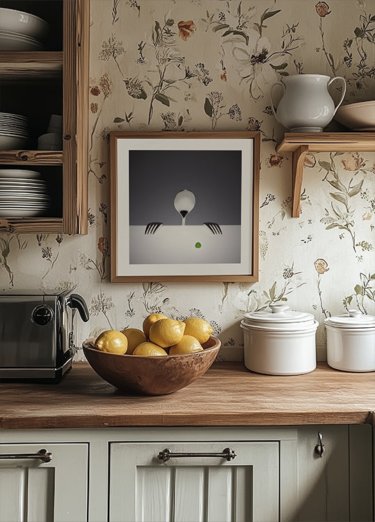 Um pôster lúdico e levemente sedutor de Wieteke de Kogel: uma única ervilha verde é cortejada por uma colher e um garfo que quase adquire personalidade. As linhas limpas, o sotaque verde fresco e a calma gráfica fazem do tema um tema moderno para iniciar uma conversa na cozinha, na sala de jantar ou no canto do café - com um brilho encantador nos olhos.