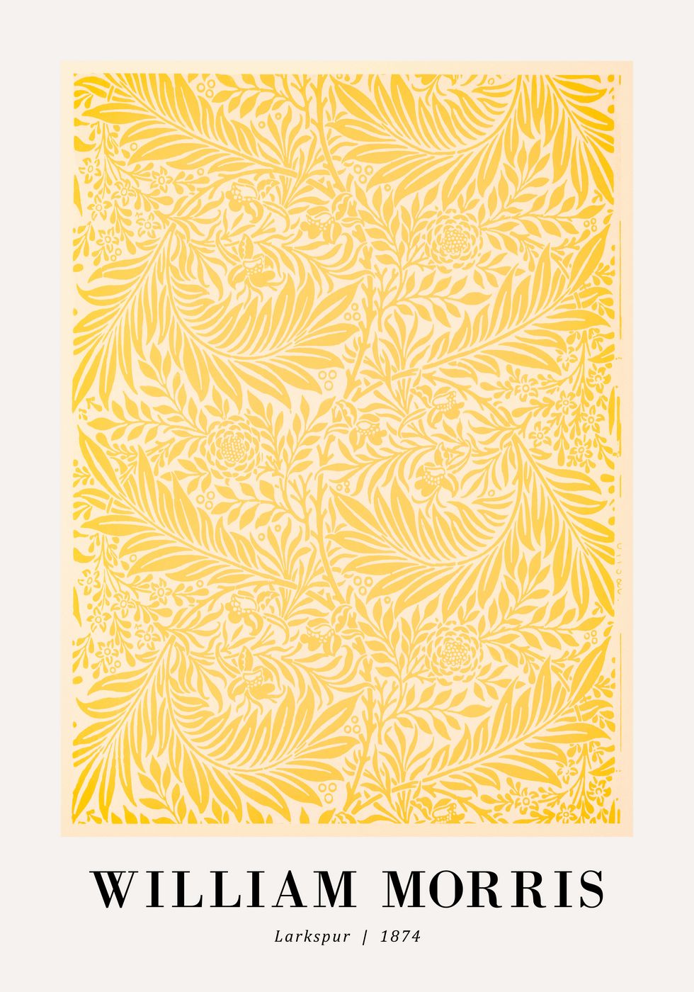 Um pôster botânico atemporal com o "padrão Larkspur de William Morris de 1874". Este padrão floral lindamente detalhado apresenta folhas e flores elegantes em um estilo vintage clássico. Perfeito para qualquer "casa inspirada na natureza, vintage ou art nouveau".